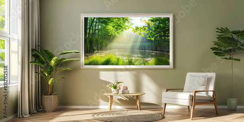 A framed photograph of a serene nature scene, intended to evoke a sense of peace and well-being in a therapy room.