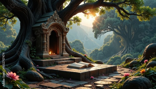 A serene forest at dawn with an intricately carved stone temple, dedicated to Valmiki, surrounded by sacred flowers and ancient scriptures scattered across a stone altar under a large banyan tree.