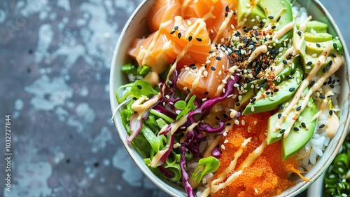 Fresh and colorful poke bowl with salmon, avocado, and sesame seeds for healthy eating inspiration