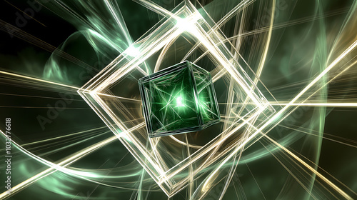 Transparent cube suspended within a glowing sphere, radiant lines connecting shapes in emerald green and silve