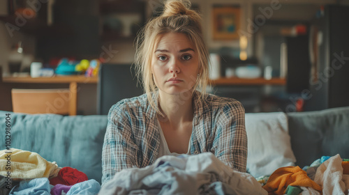 Exhausted mother sitting on couch surrounded by laundry, feeling overwhelmed by mess and responsibilities of daily life