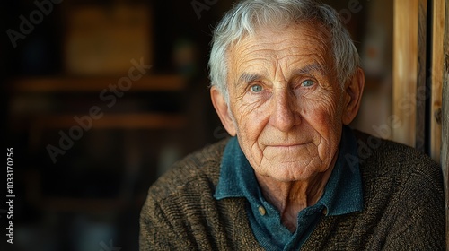 An elderly man with striking blue eyes gazing thoughtfully while sitting indoors in soft natural light, capturing a moment of serenity and reflection