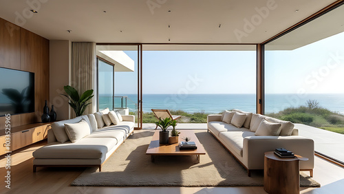 The interior design of a contemporary living space within a beachside residence is situated right by the coast.