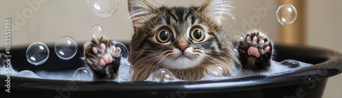 Fluffy cat with wide eyes, surrounded by bubbles in a black bathtub, playful paws reaching for floating bubbles, bubble bath fun, joyful and playful atmosphere