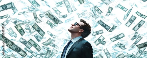 Watercolor of an entrepreneur surrounded by floating dollar bills, entrepreneur, finance, startup success and wealth
