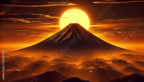 富士山頂に沈む夕日が黄金色に輝く、雲が漂う壮大な風景[ダイヤモンド富士]