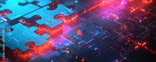 Modern graphic representation of API integration, showcasing interlocking puzzle pieces with glowing edges on a hightech abstract background to illustrate interoperability