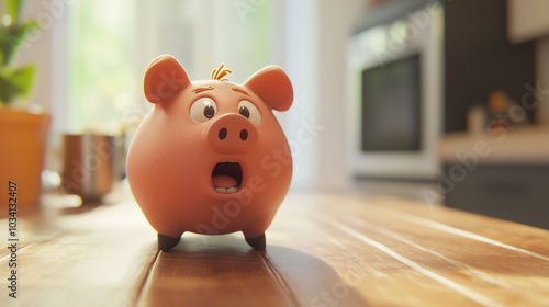 Skarbonka, z lśniącą powierzchnią i małymi nóżkami, balansuje na skraju stołu. Jej szerokie oczy i otwarta buzia wyrażają panikę, gdy spogląda w dół, jakby dostrzegała groźną przepaść.