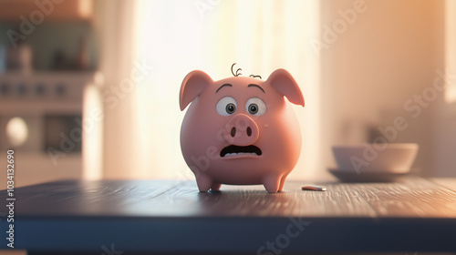 Skarbonka, z lśniącą powierzchnią i małymi nóżkami, balansuje na skraju stołu. Jej szerokie oczy i otwarta buzia wyrażają panikę, gdy spogląda w dół, jakby dostrzegała groźną przepaść.