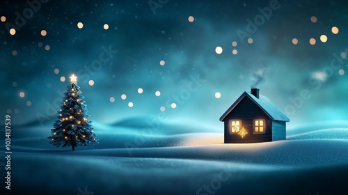 A snowy landscape with a small house adorned with Christmas lights and a decorated tree in the foreground