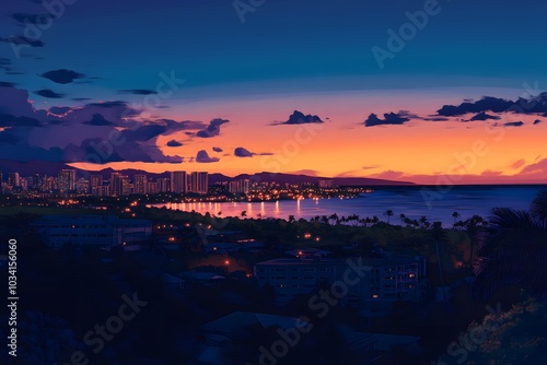 A Vibrant Sunset Over a Coastal City with Palm Trees