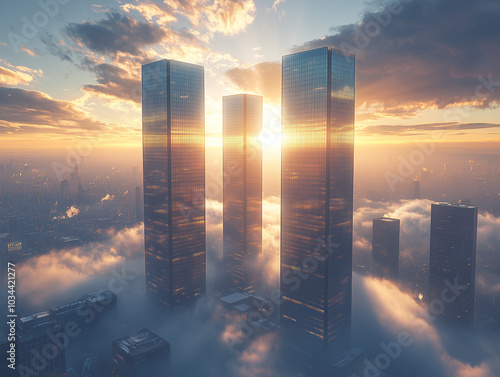 Ciekawe projekty drapaczy chmur - 0231 - Trzy Szklane wieżowce we mgle, w promieniach słońca