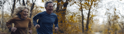 Un couple de personnes âgées souriantes faisant du jogging dans la nature avec des vêtements de sport, mode de vie actif, attitude saine, image avec espace pour texte.