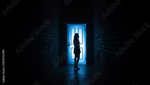 A black shadow of a woman stands in the middle of a narrow room, behind which is a door that shines blue