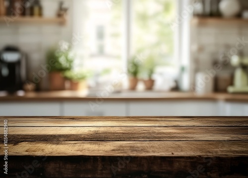 A rustic wooden table top with a blurred image of a kitchen in the background.