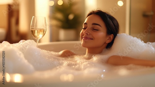A woman enjoys a tranquil bubble bath, immersed in frothy suds, while savoring a glass of wine. Soft lighting creates a calming atmosphere, enhancing her moment of relaxation and self-care.