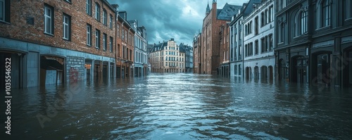 Flooded city street under a cloudy sky, with water covering the road, surrounded by historic buildings and dramatic weather conditions.