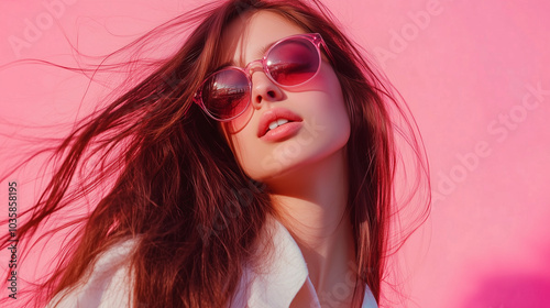 Młoda kobieta z długimi, luźnymi włosami, w modnych okularach, pozując w swobodny sposób.