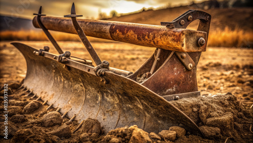 worn plow blade showcases rough texture and aged handles, reflecting its history and use in agricultural work. rustic charm adds character to landscape