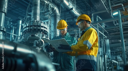 Two engineers wearing safety helmets work on high-tech machinery in a nuclear plant. Industrial environment with advanced technology.