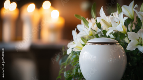White cremation urn with lilies and candles at memorial service