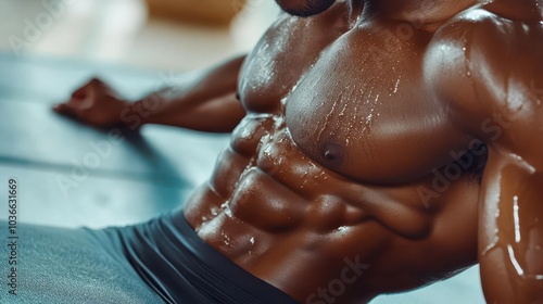 A close-up of a man's chiseled abs as he performs a crunch on a workout mat, sweat glistening on his skin