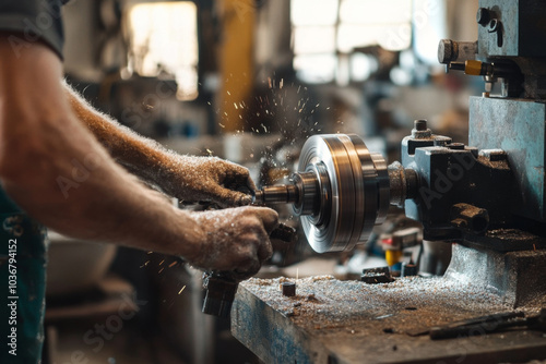 A skilled turner diligently repairs a damaged metal part using precise tools while metal shavings scatter around in a well-lit workshop environment.