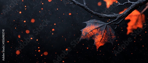A leaf dangles from a tree branch in the darkness, as orange-black raindrops fall upon it