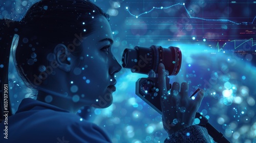 Businesswoman Using Futuristic Telescope with Digital Data Projections for Visionary Insights