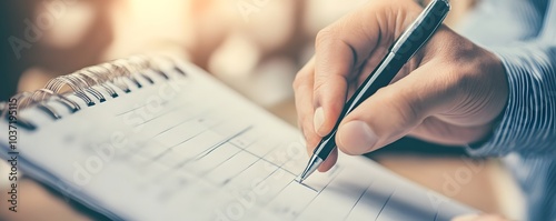 A close-up of a hand writing in a notebook with a pen, showcasing creativity and organization in a work or study environment.
