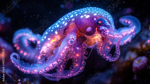 A glowing, colorful, small octopus-like creature with many tentacles. Bright lights and sparkles surround it.