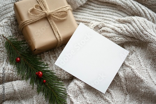 Christmas greeting card mockup with gift box, knitted sweater and fir tree branch on linen background