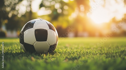 A soccer ball with focus on the pentagon pattern, outdoor setting under soft morning light, Minimalist style