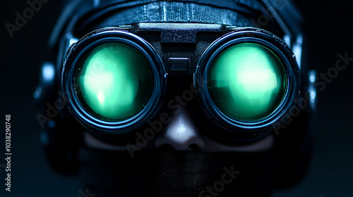 A close-up of a person wearing a black balaclava and goggles with green reflective lenses, the face is obscured, and the background is dark.