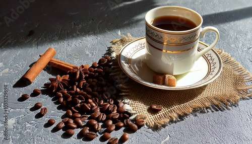 Filiżanka kawy stojąca na stole wokół rozsypane ziarna kawy oraz laska cynamonu i anyż