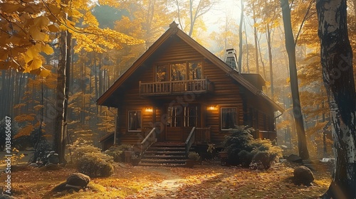 Chalet in the woods, relaxing atmosphere, pleasant sunbeams between the trees, autumn weather.