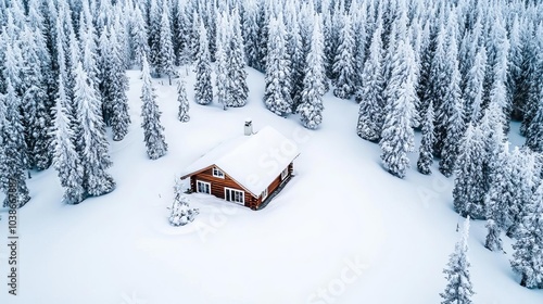 Snow-covered cabin nestled among snow-laden trees, cozy winter escape