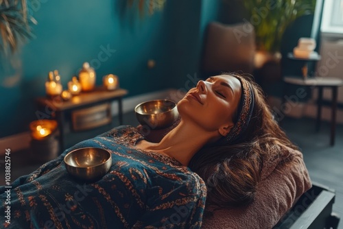 Calm woman undergoing sound therapy with bowls while resting in a spa