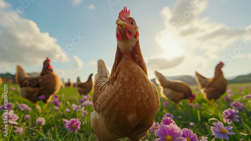 Kura na kwiecistej łące. Kura na wolnym wybiegu