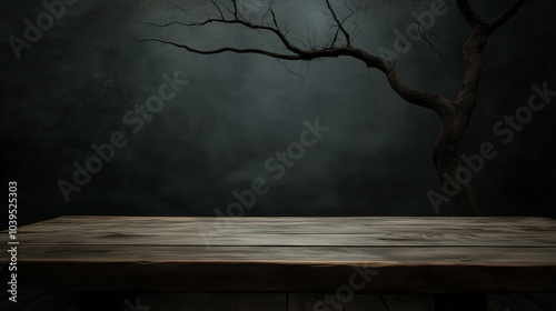 Stary, zużyty drewniany stół z wyraźnymi śladami użytkowania zajmuje centralne miejsce w mrocznej scenerii.