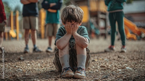 A little boy sitting on the ground with his face covered by his hands, looking upset, while a group of classmates stands around him, some pointing and laughing.