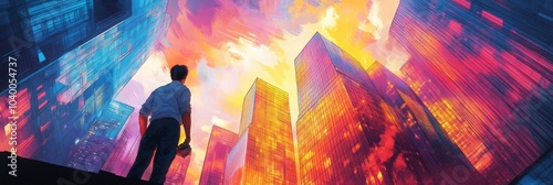Vibrant cityscape illustration featuring colorful glass skyscrapers, capturing the essence of urban life and creativity in a graphic novel setting