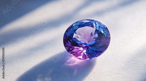 A radiant tanzanite gemstone reflecting deep blue and purple hues, placed on a smooth white surface
