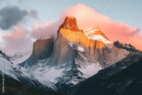 Towering dramatic mountain peaks catch the first light of sunrise, their snow caps glimmering with a warm hue under a sky painted in pastel shades of pink.
