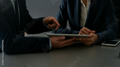 Two professionals in suits reviewing content on a tablet at a desk.