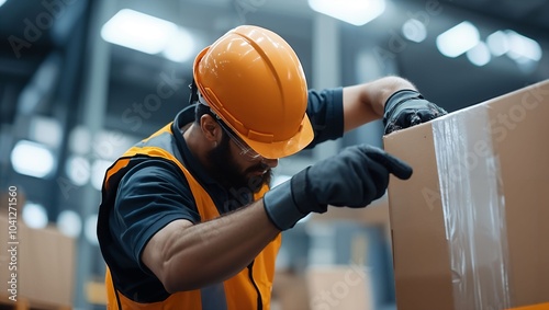A dedicated worker in a yellow safety vest and orange hard hat meticulously opens a box in a vast warehouse, showcasing the diligence found in modern manual labor environments.
