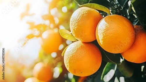Lush orange farm with glistening ripe fruits basking in the warm golden sunshine on a bright and serene summer day Peaceful rural landscape showcasing the bountiful harvest of the orange plantation
