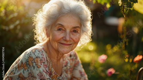 Smiling elderly woman with deep wrinkles, wearing a floral dress, sitting in a garden, warm sunlight, making direct eye contact