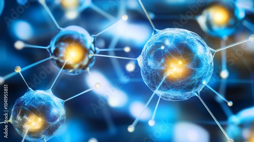 Microscopic view of glowing particles decaying into smaller fragments, symbolizing particle decay in a physics lab setting with scientific instruments and equipment in the background.