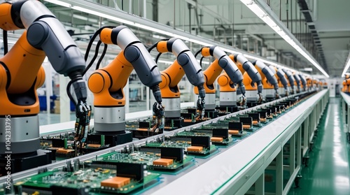 A series of robotic arms work in unison to assemble circuit boards on a production line. The bright, clean environment highlights advanced technology in electronics manufacturing